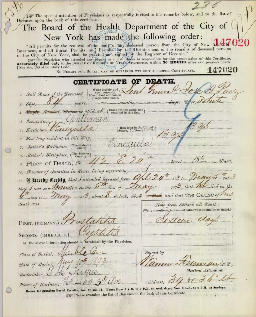 Departamento de Salud de la Ciudad de Nueva York. Certificado de defunción de José Antonio Páez. Mayo de 1873