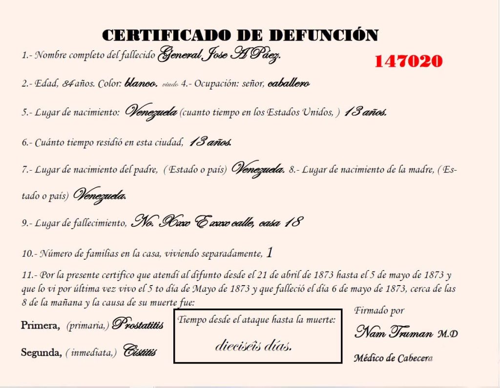 “Con el más profundo dolor doy a V. la triste noticia, de que a las siete y media de la mañana del 6 del corriente, falleció en Nueva York, el Ciudadano General en Jefe José Antonio Páez, de resultas de inflamación de la vejiga, habiendo estado en cama tres días”
